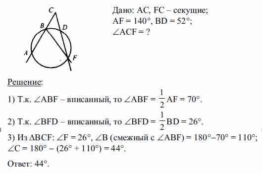 Найдите острый угол, образованный двумя секущими, проведёнными из точки, лежащей вне окружности, если дуги, заключённые между секущими, равны 140° и 52
