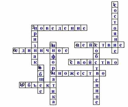 По вертикали. 1. Определённое сочетание всех или некоторых свойств некоторого объекта. 2. Свойства, действие, поведение, состояние объекта. 3. Наука, изучающая закономерности протекания процессов передачи, хранения и обработки информации в природе, обществе, технике, а также способы автоматизации этих процессов с помощью компьютера. 5. Имя, предназначенное для обозначения конкретного, вполне определённого объекта, выделяющее этот объект из ряда однотипных объектов. 8. Имя, обозначающее множество объектов.
