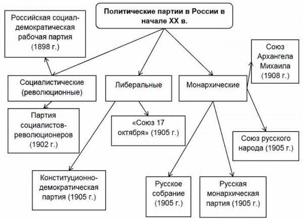 Заполните пропуски в схеме. Используйте в работе содержание пунктов 5 и 6 § 30, а также пунктов 5 и 6 § 28. Укажите в скобках время образования каждой партии.