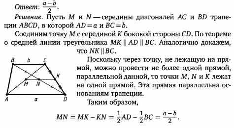 Основания трапеции равны а и b (а>b). Найдите длину отрезка, соединяющего середины диагоналей трапеции.