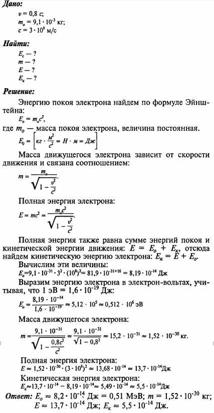 Электрон движется со скоростью 0,8 скорости света. Определить: массу электрона, энергию покоя электрона (в джоулях и электрон-вольтах), полную энергию электрона, кинетическую энергию электрона.