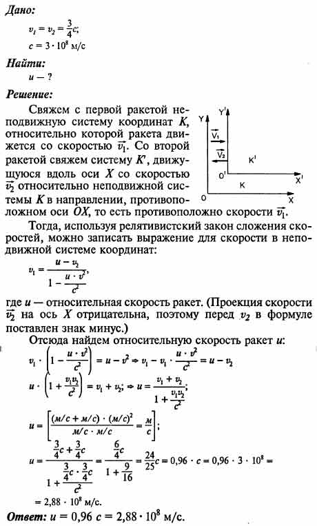 Две ракеты движутся навстречу друг другу со скоростями 3/4 с относительно неподвижного наблюдателя. Определить скорость сближения ракет.