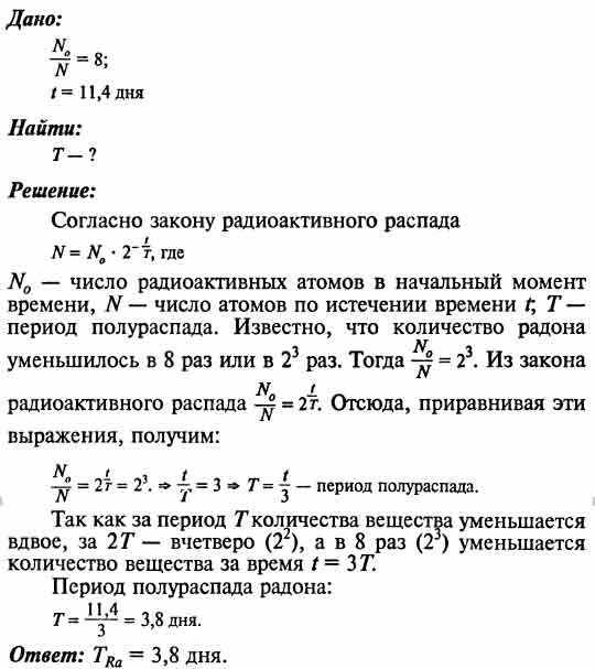 Имелось некоторое количество радиоактивного радона. Количество радона уменьшилось в 8 раз за 11,4 дня. Каков период полураспада радона?
