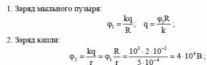 Мыльный пузырь радиусом R = 2⋅см заряжен до потенциала ϕ = 1 кВ. Пузырь лопнул, превратившись в каплю воды радиусом r = 5⋅10 − 4 м. Найти потенциал образовавшейся капли