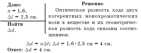 Какова оптическая разность хода двух когерентных монохроматических волн в веществе, абсолютный показатель преломления которого 1,6, если геометрическая разность хода лучей равна 2,5 см?