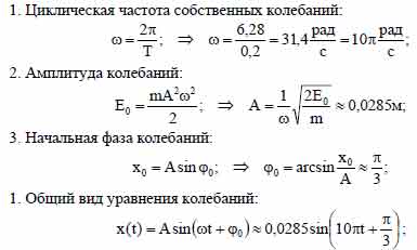 Горизонтальный пружинный маятник, состоящий из шарика и пружины, совершает гармонические колебания. Шарик массой 50 г колеблется вдоль горизонтальной оси ОХ с периодом Т = 0,2 с. В начальный момент времени система обладает энергией Е0 = 0,02 Дж, и шарик находится на расстоянии х0 = 2,5 см от положения равновесия. Напишите закон движения шарика: уравнение изменения координаты шарика от времени х = х(t) (все величины записать в единицах СИ).
