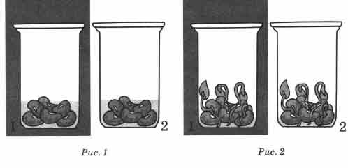 Известно, что для прорастания семян необходимы определенные условия. Александр решил выяснить роль одного из условий, проведя следующий опыт. Он взял два одинаковых стакана, в которых было немного воды, и положил в каждый по 10 семян фасоли, причем стакан № 1 он поставил в темное место, а стакан № 2 оставил на свету (рис. 1). Оба стакана находились в одном помещении с комнатной температурой. Через несколько дней Александр наблюдал следующую картину (рис. 2).