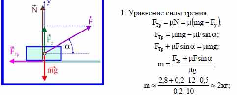 Массивный брусок движется поступательно по горизонтальной плоскости под действием силы, направленной под углом α = 300 к горизонту. Модуль этой силы F = 12 Н. Коэффициент трения между бруском и плоскостью μ = 0,2. Модуль силы трения, действующей на брусок FТр = 2,8 Н. Чему равна масса бруска?
