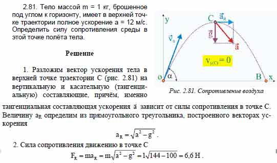 Тело массой m = 1 кг, брошенное под углом к горизонту, имеет в верхней точке траектории полное ускорение a = 12 м/с. Определить силу сопротивления среды в этой точке полёта тела