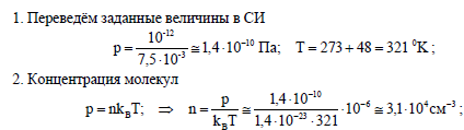Современные вакуумные насосы позволяют понижать давление до величин порядка р = 10^-12 мм. рт. ст. Сколько молекул газа содержится в объёме V = 1 см3 при таком давлении и температуре t = 48 °С?