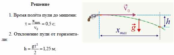 Пуля вылетает из ствола в горизонтальном направлении со скоростью 800 м/с. На сколько снизится пуля во время полёта, если щит с мишенью находится на расстоянии 400 м?