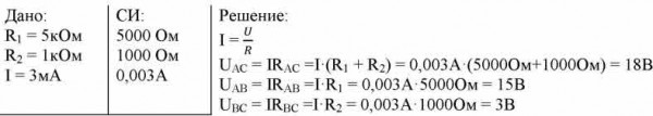 Два проводника, сопротивления которых R1 = 5 кОм и R2 = 1 кОм, соединены последовательно (рис. 184), Сила тока в цепи равна 3 мА. Определите показания вольтметра, включённого между точками А и С. Что будут показывать вольтметры,  включённые между точками A  и В, В и С?
