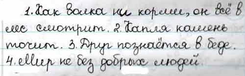 1. Как волка ни корми, он всё в лес (смотрит/глядит). 2. Капля камень (точит/долбит). 3. Друг познаётся (в беде/в горе). 4. (Свет/мир) не без добрых людей.