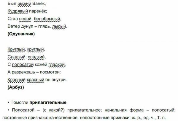 Какие слова помогли тебе узнать предметы? Подчеркни в текстах имена прилагательные. Разбери выделенное слово как часть речи.